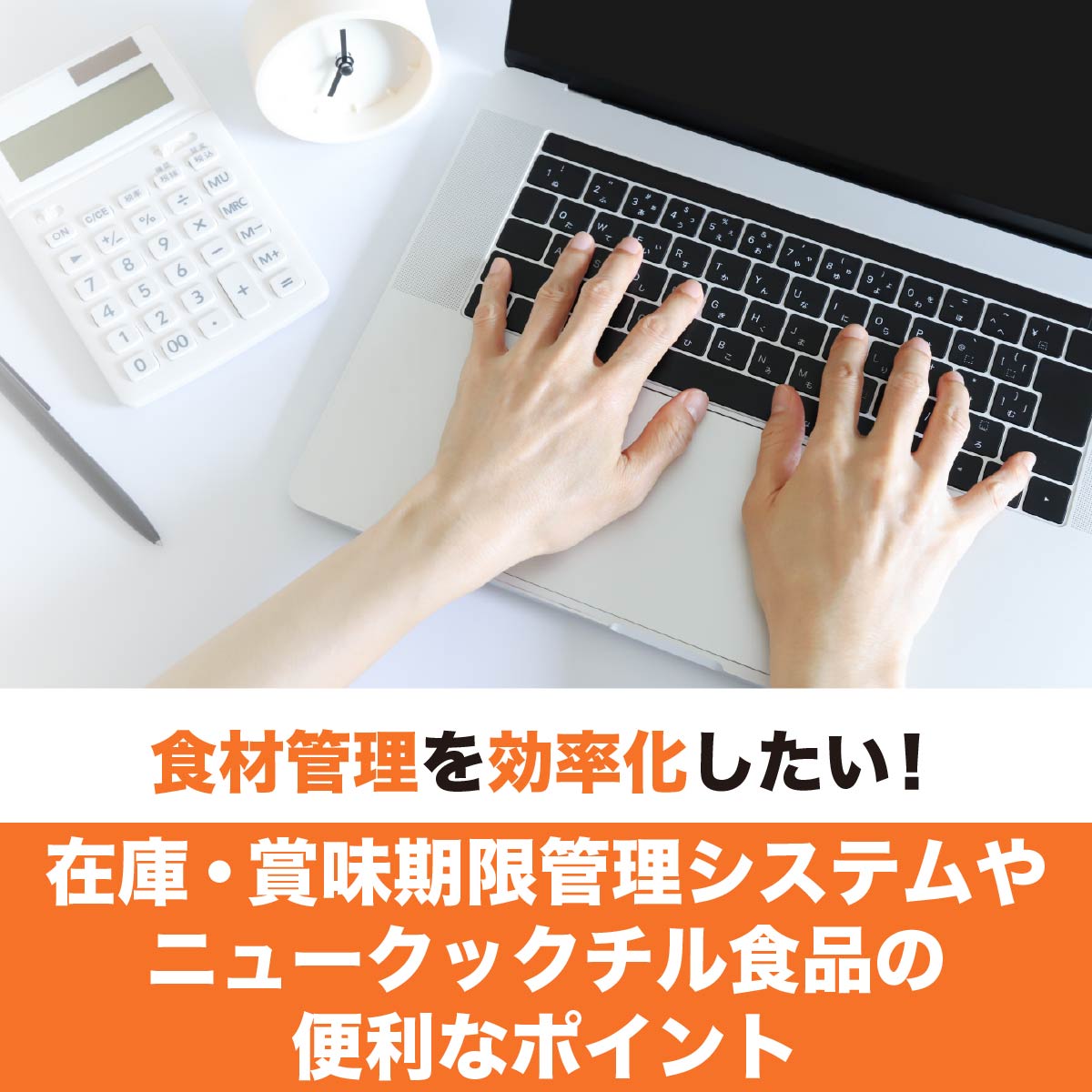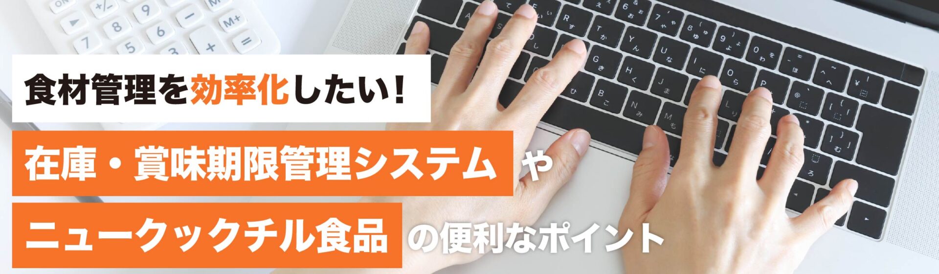 これらの課題解決には、セントラルキッチンでまとめて調理することで各施設の食材ロスを少しでも減らしたり、調理した食品を急速凍結や急速冷却するなどで衛生的に少しでも長く保存できる調理方式を利用したりすることが役立ちます。いずれの場合も、期限管理や衛生管理の不備や過剰発注などを防ぐために、食材管理は欠かせません。