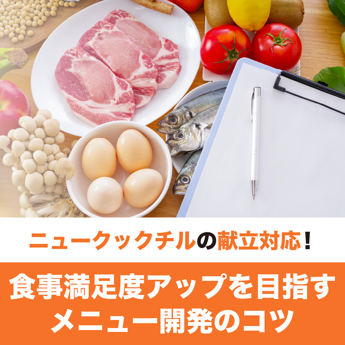 ニュークックチルを活用する際には、献立作成にも工夫が必要です。この記事では、献立対応前に改めて確認したいニュークックチルの特徴をはじめ、献立制限が必要になる理由やメニュー開発のコツについて解説します。ニュークックチルを活用したいけれど、栄養管理に留まらない美味しい食事作りに課題を感じている、今よりも食事満足度を上げたいとお悩みの施設さまはぜひご覧ください。
