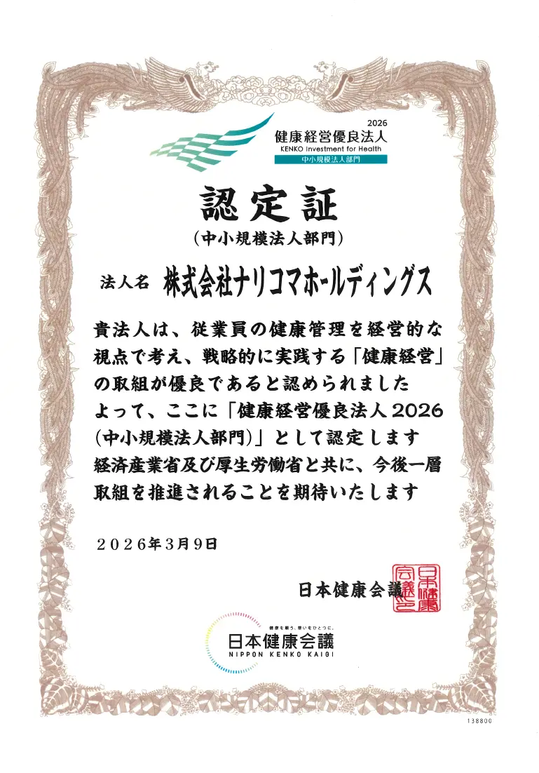 株式会社ナリコマホールディングス(本社:大阪市淀川区 以下、ナリコマ)は、2026年3月9日、経済産業省と日本健康会議が共同で選定する「健康経営優良法人2026(中小規模法人部門)」に認定されました。