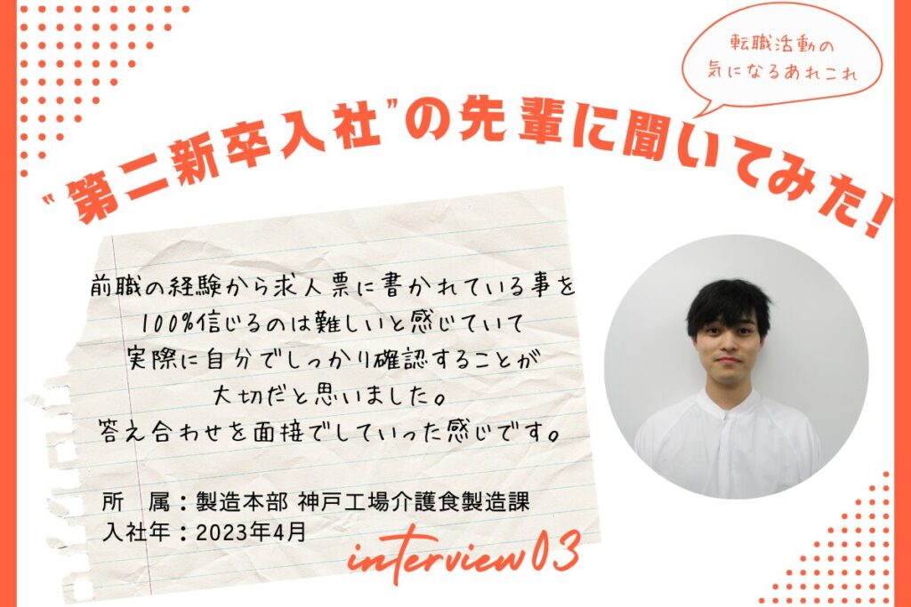 私の目標は「新卒がつくる工場」を実現すること。経験がなくても、やりたい気持ちがあれば十分です。もともと“ど素人”だった私を含め、多くの仲間が支え合ってここまで来ました。人間関係で悩まず、安心して挑戦できる神戸工場で、一緒に未来をつくっていきましょう。