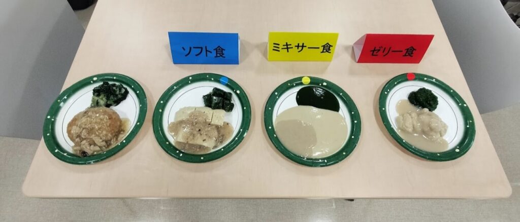 続いては盛り付け実演。先輩社員が 「常食・ソフト食・ミキサー食・ゼリー食」 を目の前で仕上げていきます。この日のメニューは、実際に施設で提供している「きのこソースのハンバーグ」!学生のみなさんも真剣に見学していました。