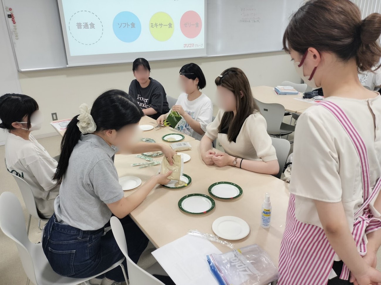 先輩のお手本を見た後は、学生の皆さんも「ミキサー食・ゼリー食」の盛り付けを体験。“手軽さ”や“彩り” を肌で感じました。