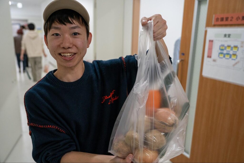 包装課の西岡さんも、しっかり大量ゲット。普段の包装課での技術が活かされている!?