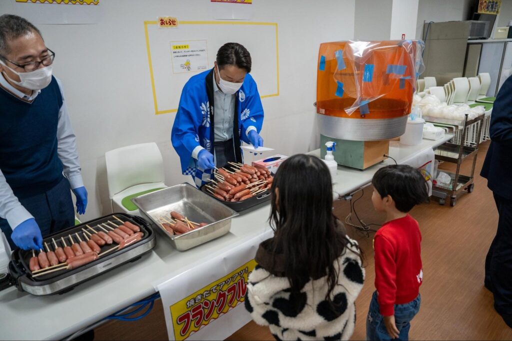 挨拶が終わると、社長がハッピ姿でフランクフルトを手渡し。