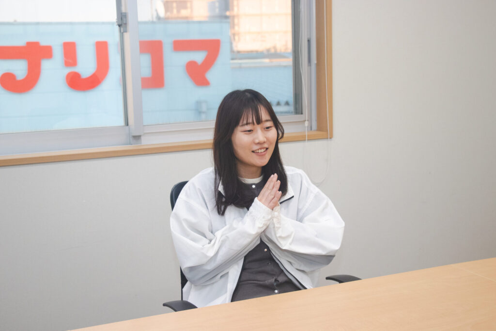 これから入ってくる後輩には……そうですね、私が部署内で唯一年齢が近い先輩になるので、ちょっとした困りごとでも気軽に聞いてほしいです。 素直で、分からないことをその場で聞ける子。そして「誰かのために動くことが好きな人」「回りを見る力がある人」に来てもらえたら嬉しいですね。 不安もあると思いますが、ナリコマは本当に人が温かいので、自分らしく飛び込んできてください!