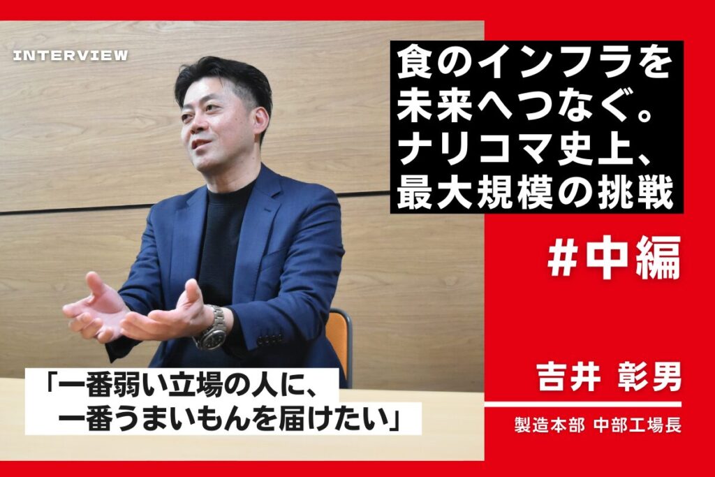 自動車業界の板金塗装職人を経て、ナリコマに入社。現場の最前線を知る叩き上げとしてキャリアを重ね、現在は最新鋭の自動化設備を備える神戸工場の工場長を務める。マネジメントの核にあるのは「心理的安全性」。単なる仲良しクラブではなく、役職に関係なく「おかしいことはおかしい」と本音でぶつかり合える組織づくりを徹底している。「工場はしんどい。だからこそ嘘はつかない」という誠実な姿勢で、2027年の大規模プロジェクト「ミキサー食移管」に向けた体制構築と、次世代の育成に挑み続けている。
