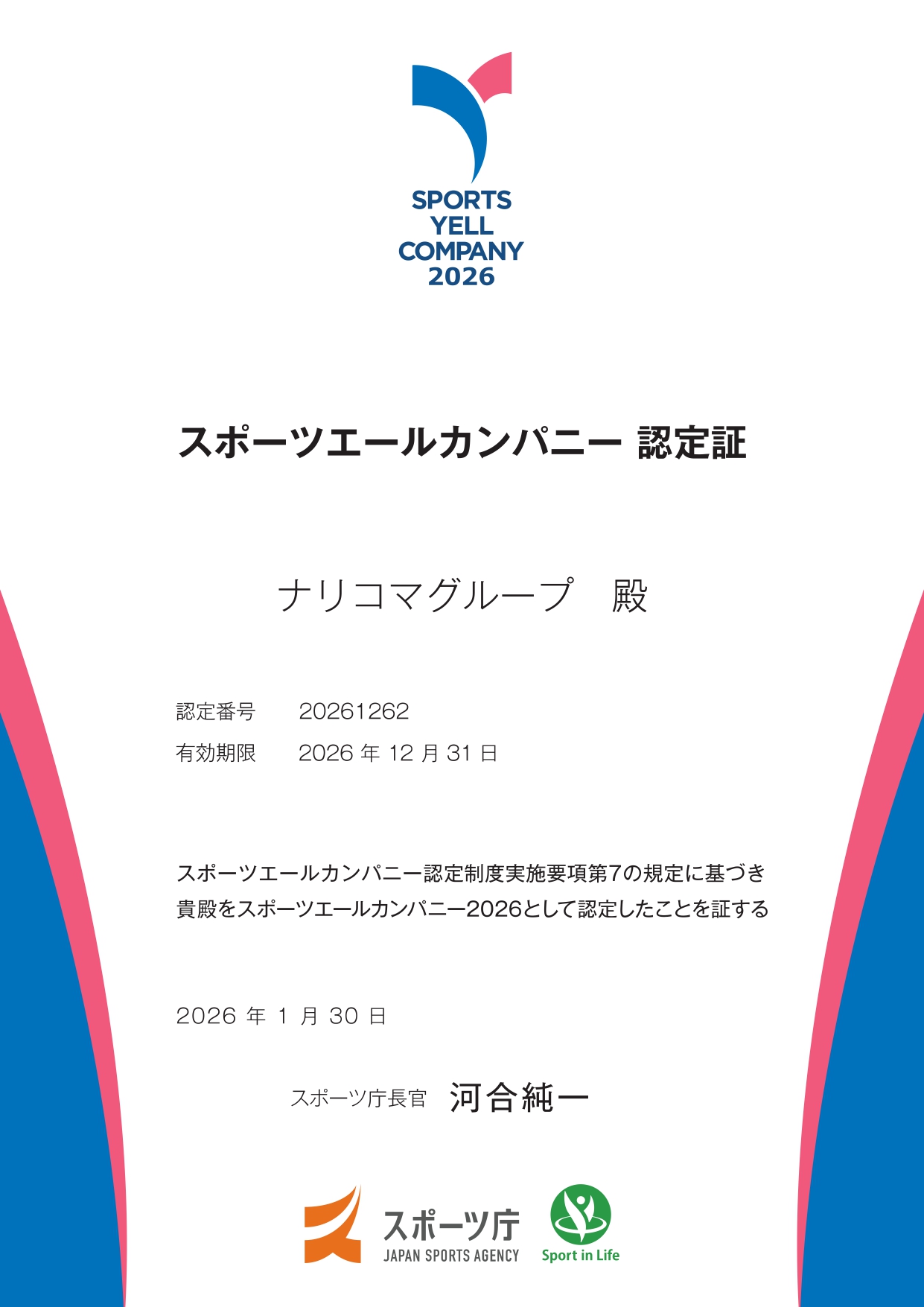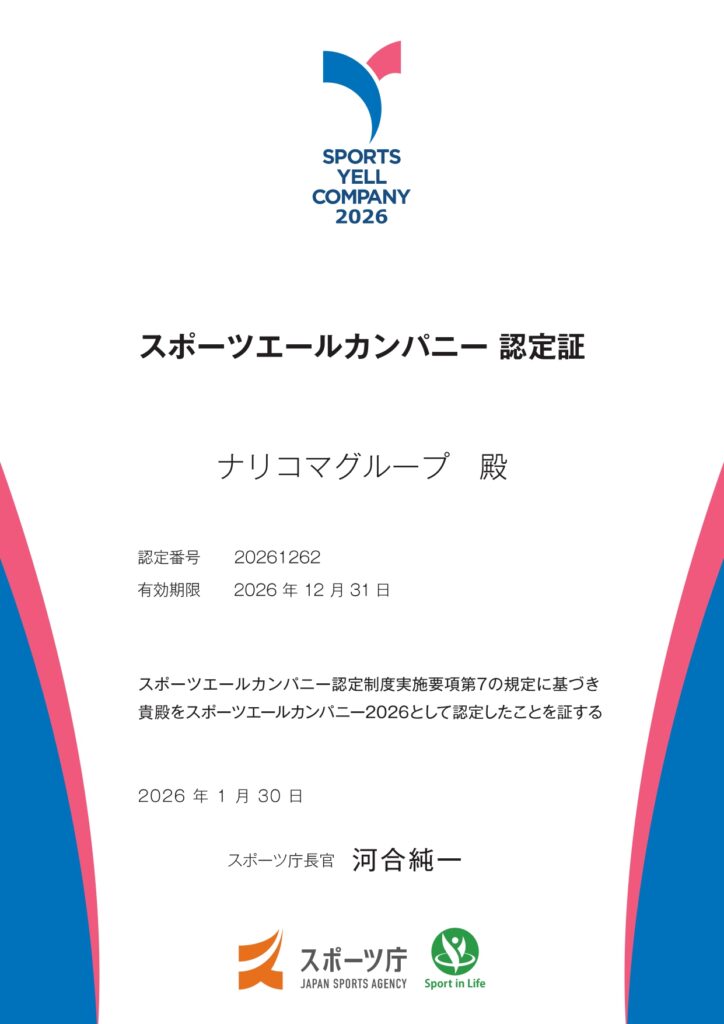 このたび、スポーツ庁が認定する「スポーツエールカンパニー2026」に、ナリコマグループが認定されました!