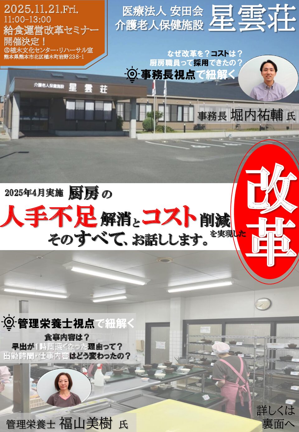 【現地:熊本/オンラインあり】事務長、管理栄養士2名の講師が紐解く「人手不足解消とコスト削減を実現した給食運営改革セミナー」