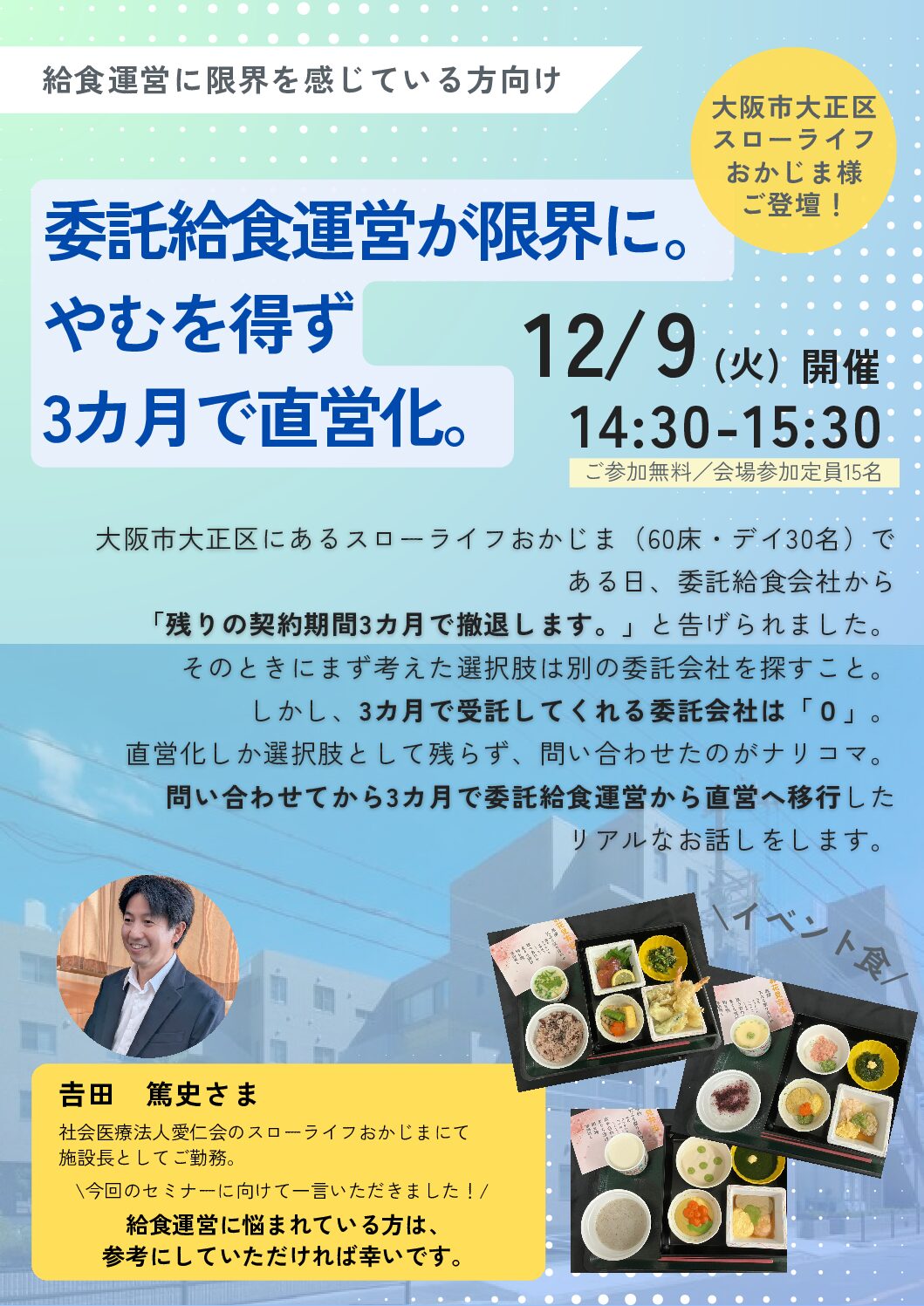 大阪市大正区にあるスローライフおかじま(60床・デイ30名)で ある日、委託給食会社から 「残りの契約期間3カ月で撤退します。」と告げられました。 そのときにまず考えた選択肢は別の委託会社を探すこと。 しかし、3カ月で受託してくれる委託会社は「0」。 直営化しか選択肢として残らず、問い合わせたのがナリコマ。 問い合わせてから3カ月で委託給食運営から直営へ移行した リアルなお話しをします。