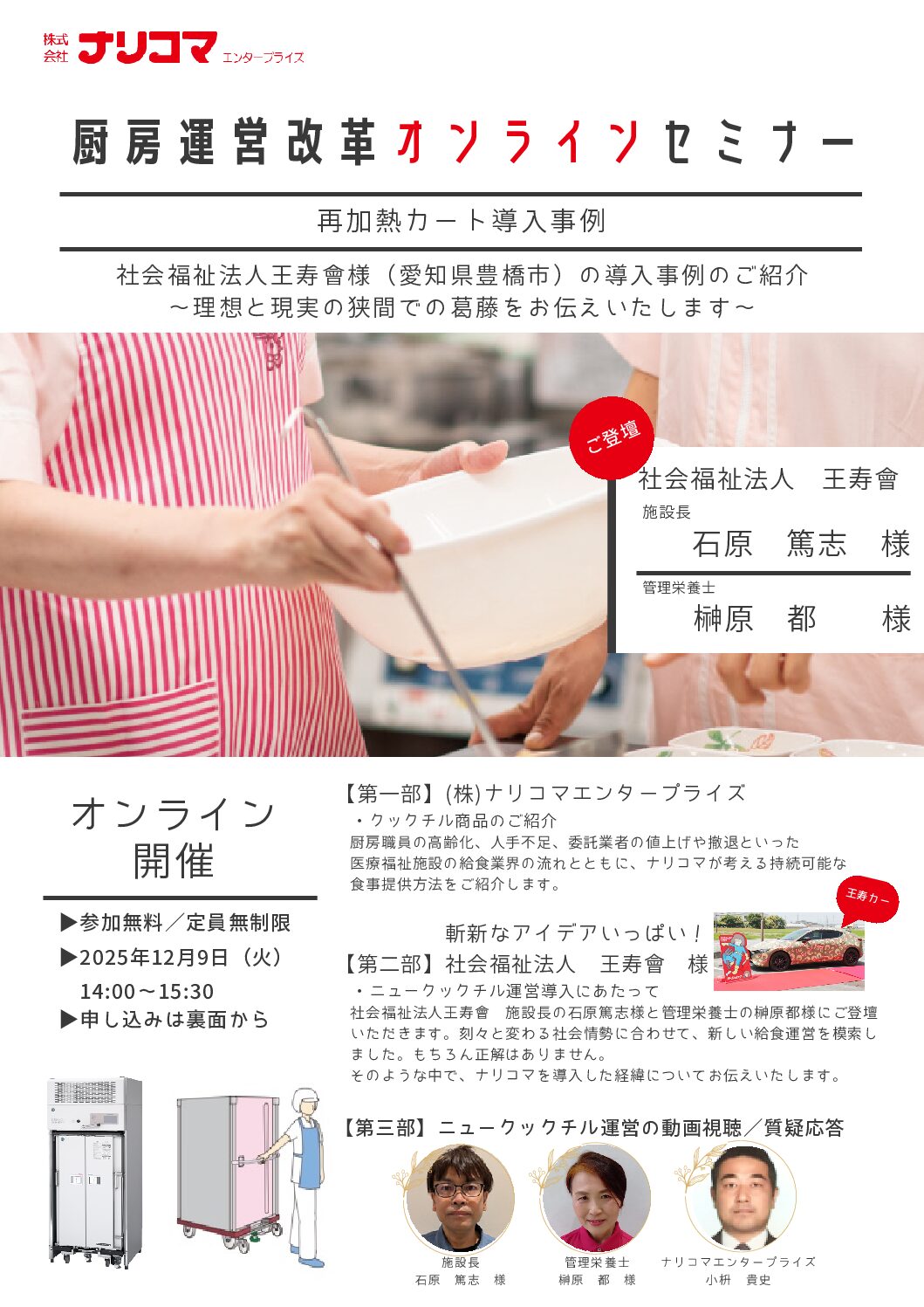 アイデア豊富な愛知県豊橋市の王寿會様が、2023年に地域密着型特別養護老人ホームを新設される際、 今後の人不足を検討し、悩まれ、再加熱カート導入至った経緯をお話しいただきます。 実際、同じ悩みを抱えられている施設様も多いのではないでしょうか? 結果の検証についてもお話しいただきます。 運営については今回は動画でのご案内もご準備致しました。是非、ご視聴いただき参考にしてください。