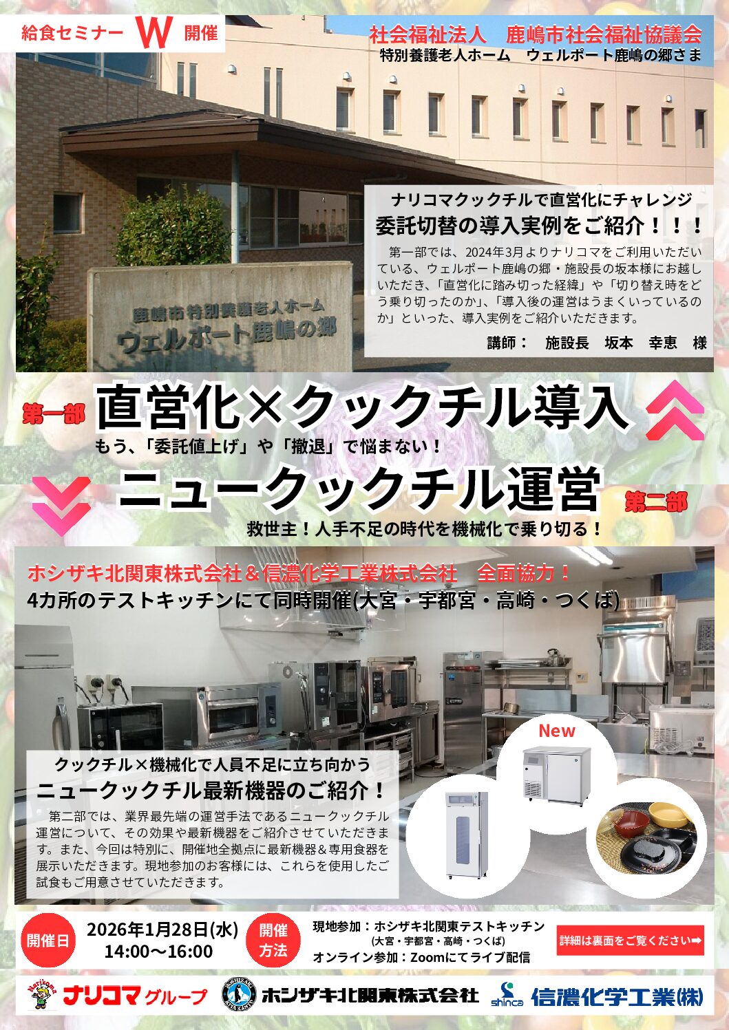 ご登壇講師:特別養護老人ホーム ウェルポート鹿嶋の郷 施設長様 協力企業:ホシザキ北関東株式会社・信濃化学工業株式会社 ☆第一部☆ ナリコマクックチルで直営化にチャレンジ委託切替の導入実例をご紹介!!! 第一部では、2024年3月よりナリコマをご利用いただいている、ウェルポート鹿嶋の郷・施設長の坂本様にお越しいただき、「直営化に踏み切った経緯」や「切り替え時をどう乗り切ったのか」、「導入後の運営はうまくいっているのか」といった、導入実例をご紹介いただきます。 ☆第二部☆ クックチル×機械化で人員不足に立ち向かう。ニュークックチル最新機器のご紹介! 第二部では、業界最先端の運営手法であるニュークックチル運営について、その効果や最新機器をご紹介させていただきます。また、今回は特別に、開催地全拠点に最新機器&専用食器を展示いただきます。現地参加のお客様には、これらを使用したご試食もご用意させていただきます。