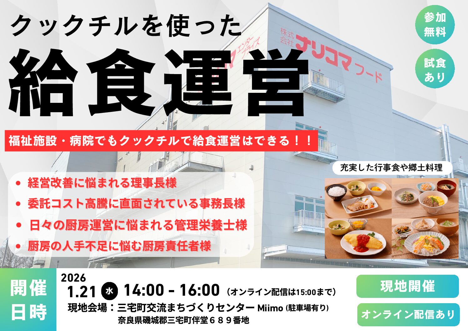 【奈良県開催・オンラインあり】クックチルを使った給食運営 福祉施設・病院でもクックチル運営はできる!!