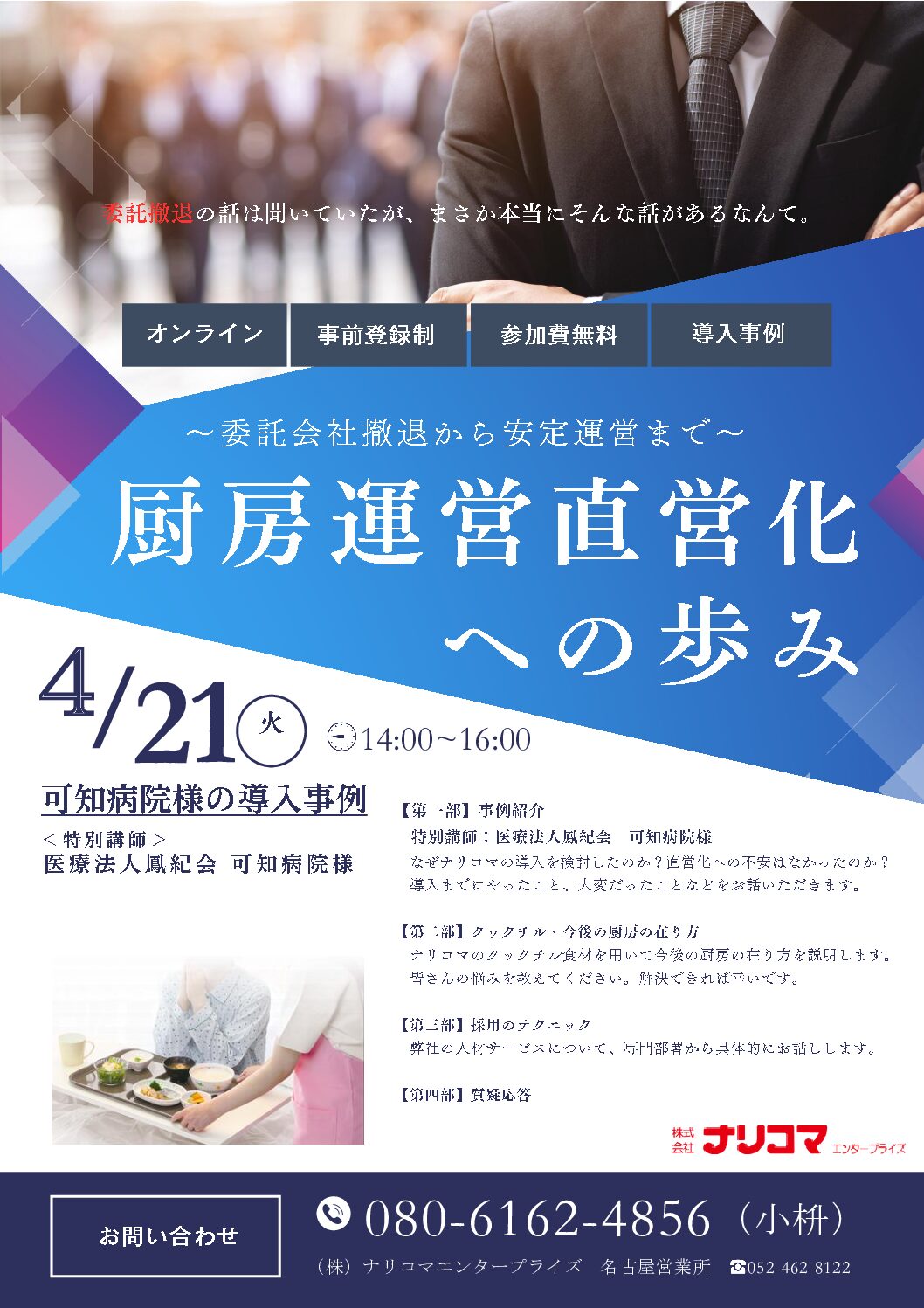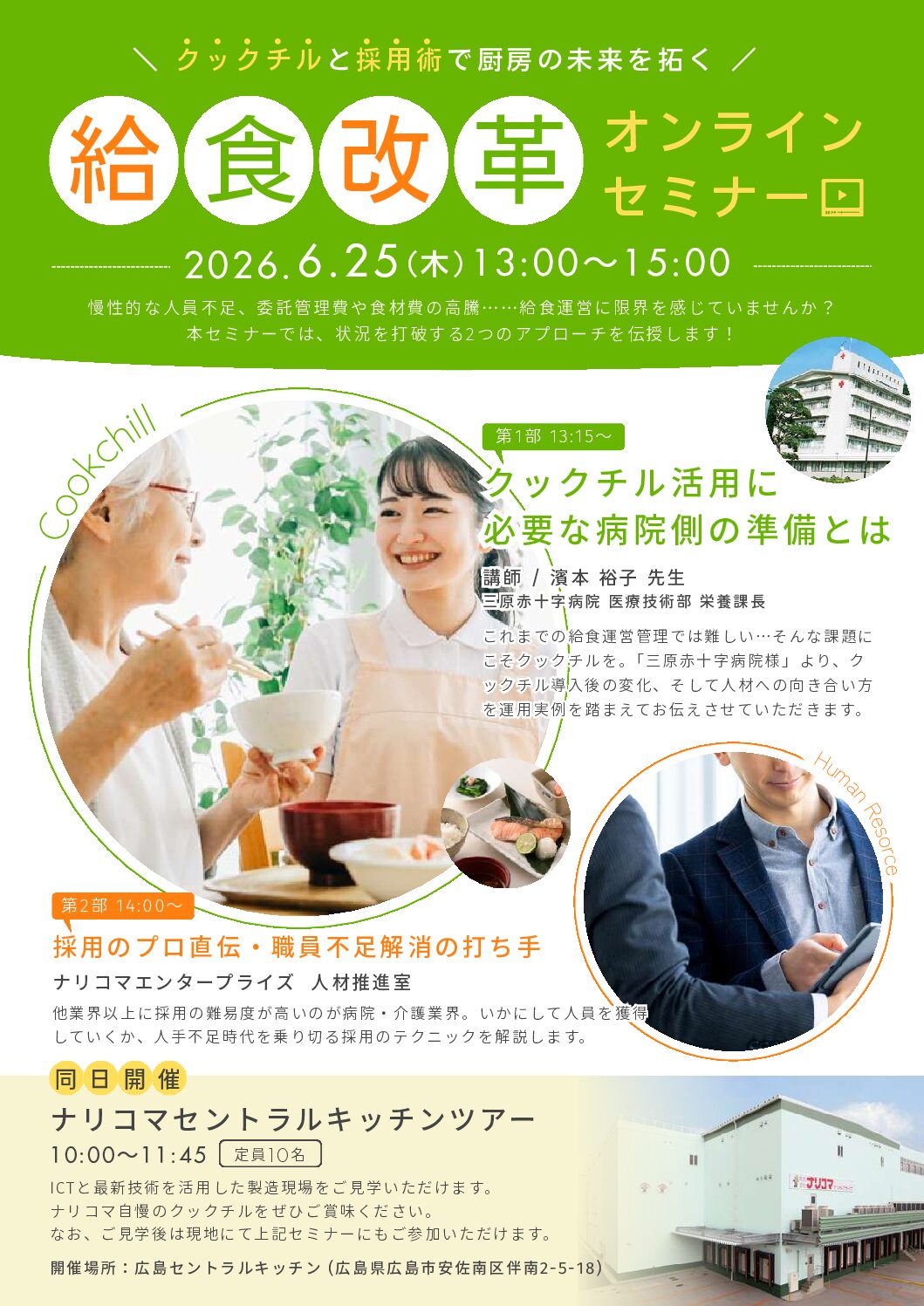 物価高騰、最低賃金の上昇で給食費用は増加するだけではなく、調理員の人材不足とコストとヒトの課題が多い給食運営。 今後も生産年齢人口は減少し、食材費の値上がりもどこまで続くのか分からない今 クックチルを使用して給食提供をしている三原赤十字病院の濱本様に導入事例をご紹介いただきます。 また、ナリコマから悩みの種である「人材確保」についてアイデアをご紹介させていただきます。 講師:三原赤十字病院 医療技術部 栄養課長 濱本 裕子 様 ※2025年12月16日開催のセミナーのオンデマンド配信です。