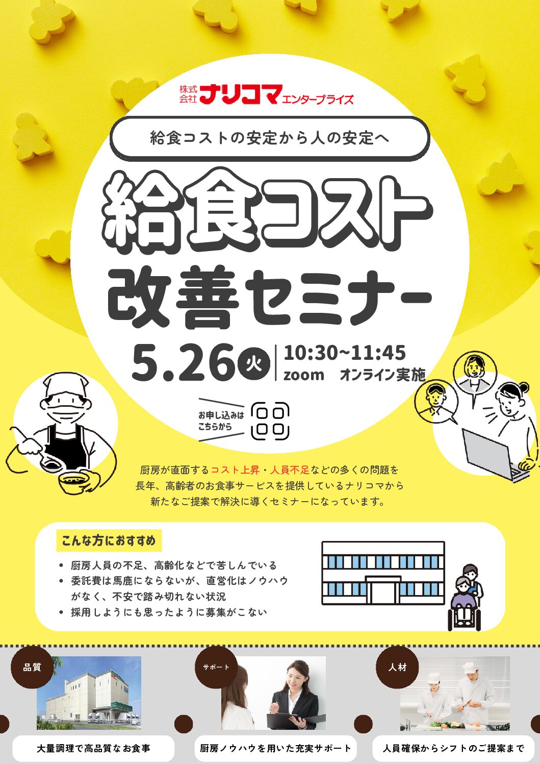 厨房が直面するコスト上昇・人員不足などの多くの問題を長年、高齢者のお食事サービスを提供しているナリコマから新たなご提案で解決に導くセミナーになっています。