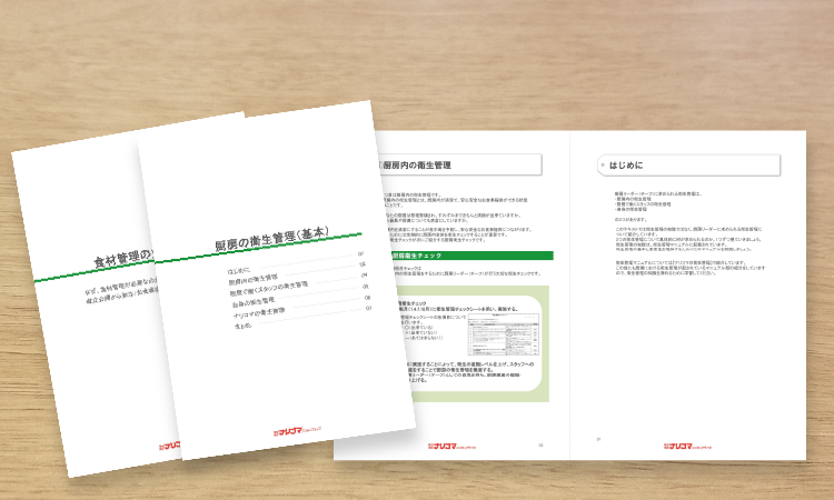 一から作成するのがめんどうな各種業務のマニュアルをオリジナルシステム内に完備しています。特に、非常時・災害時に困ることがないよう、日常的にマニュアルを整備しておく必要があります。ユーザー専用サイトから厨房運営における危機管理やスタッフ育成、栄養管理、衛生管理、発注業務などの多数のマニュアルを無料でダウンロードすることができます。